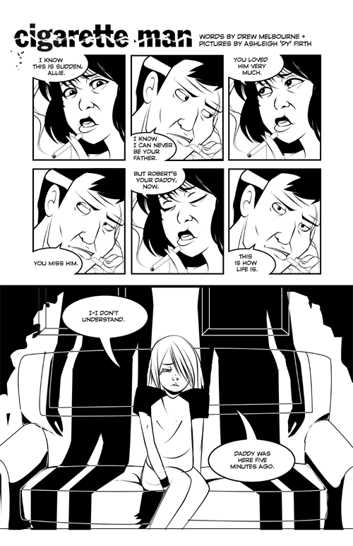 In the mean time, here's the first page of my short story, called "Cigarette Man"...